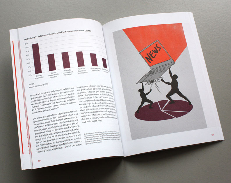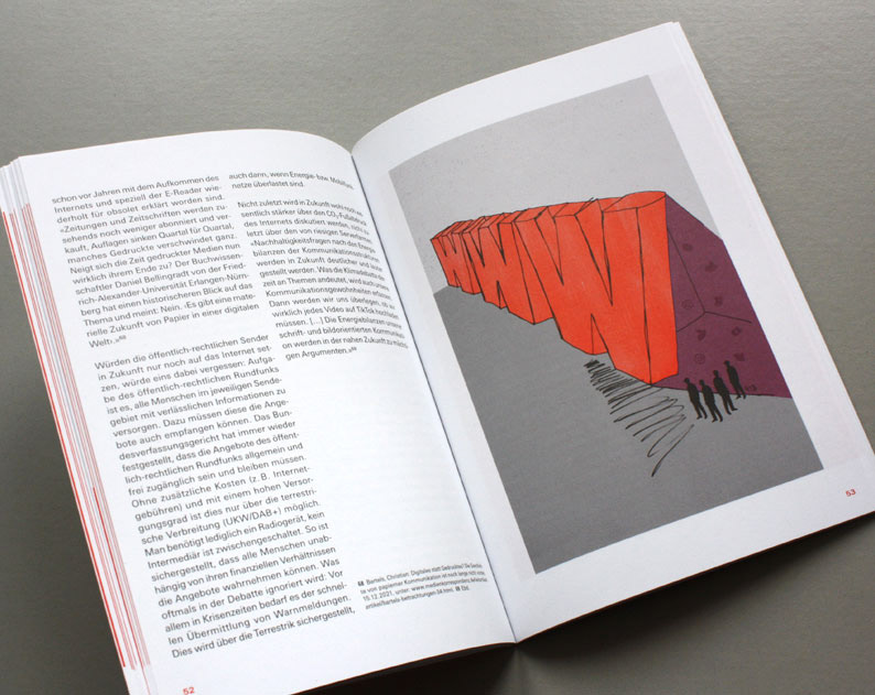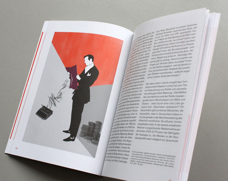 „Medien sammeln und sortieren Informationen, ordnen sie ein und verbreiten sie. Mit ihren Erzählungen prägen sie und ihre Macher*innen unser Weltbild. Das macht sie zu mächtigen Akteuren, über deren Funktionsweise und Arbeit zu Recht gestritten wird.“ Mandy Tröger Die zweite erfolgreiche Zusammenarbeit mit der Rosa Luxemburg Stiftung war erneut geprägt von erfreulich viel Freiraum für die Interpretation des Illustratoren auf das äußerst aktuelle Thema. Die Publikation kann hier bestellt werden: